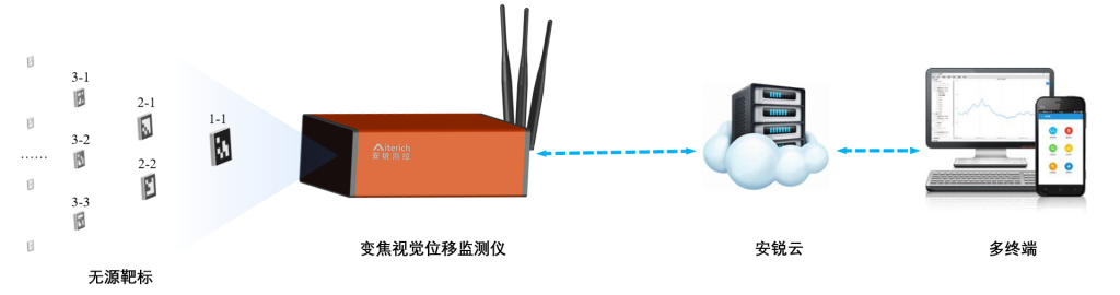 变焦视觉识别出无源靶标的图像位移,嵌入式算法将图像位移 转换到实际位移,上传到云平台,实现结构位移的非接触式测量。