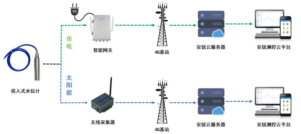 投入式水位计主要由水位计、采集器、4G基站以及安锐云平台组成。