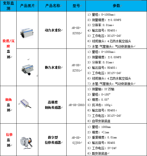 变形监测:挠度沉降、倾斜、相对位移应使用动力水准仪、静力水准仪、倾斜仪、位移传感器等。
