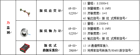 振动监测:桥梁固有频率应使用振动加速度计。荷载监测:车辆荷载监测使用动态称重传感器。应力应变监测:表面应变应使用应变计,索力、拉力等应使用锚索测力计。