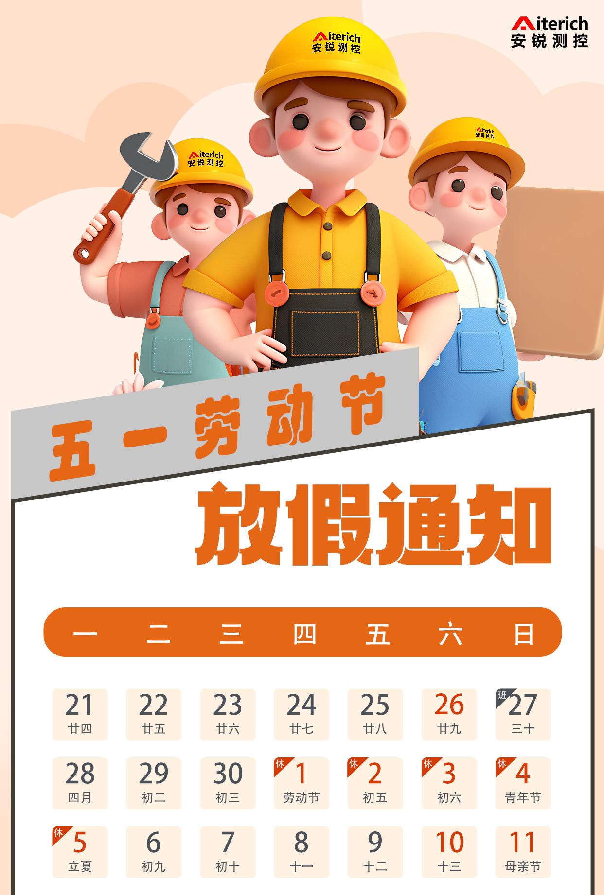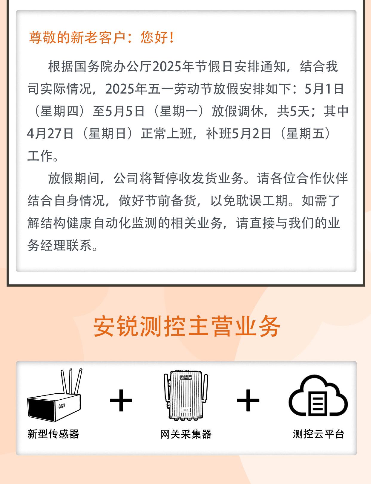 尊敬的新老客户:您好!根据国务院办公厅2025年节假日安排通知,结合我司实际情况,2025年五一劳动节放假安排如下:5月1日星期四)至5月5日(星期一)放假调休,共5天;其中4月27日(星期日)正常上班,补班5月2日(星期五)工作。放假期间,公司将暂停收发货业务。请各位合作伙伴结合自身情况,做好节前备货,以免耽误工期。如需了解结构健康自动化监测的相关业务,请直接与我们的业务经理联系。
