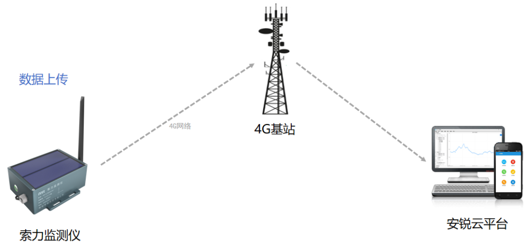 系统由4G索力监测仪、网络基站和安锐云平台组成, 手机、电脑随时查看数据,异常自动报警