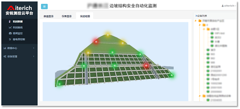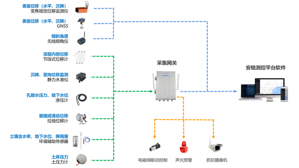 边坡监测系统是融合前端传感器、中端采集器以及后端云平台组成的自动化安全监测体系。该系统通过在边坡关键区域安装智能传感器,实时采集地表位移、深部变形、孔隙水压力、降雨量及岩土体应力应变等核心参数,实现对边坡稳定性状态的动态感知与形变趋势智能推演。当系统监测到位移速率超限、深层滑移面突变、地下水位骤升或降雨量触发阈值时,安锐云平台自动激活多级预警机制(蓝/黄/红警报),通过短信、平台弹窗、现场声光报警等多渠道推送风险信息,同步生成地质加固建议与应急避险指令(如交通阻断或人员撤离),为边坡防护动态设计、灾害应急处置及工程运维决策提供全链条数据支撑,推动边坡安全管理从被动抢险向预测性防护的范式升级。