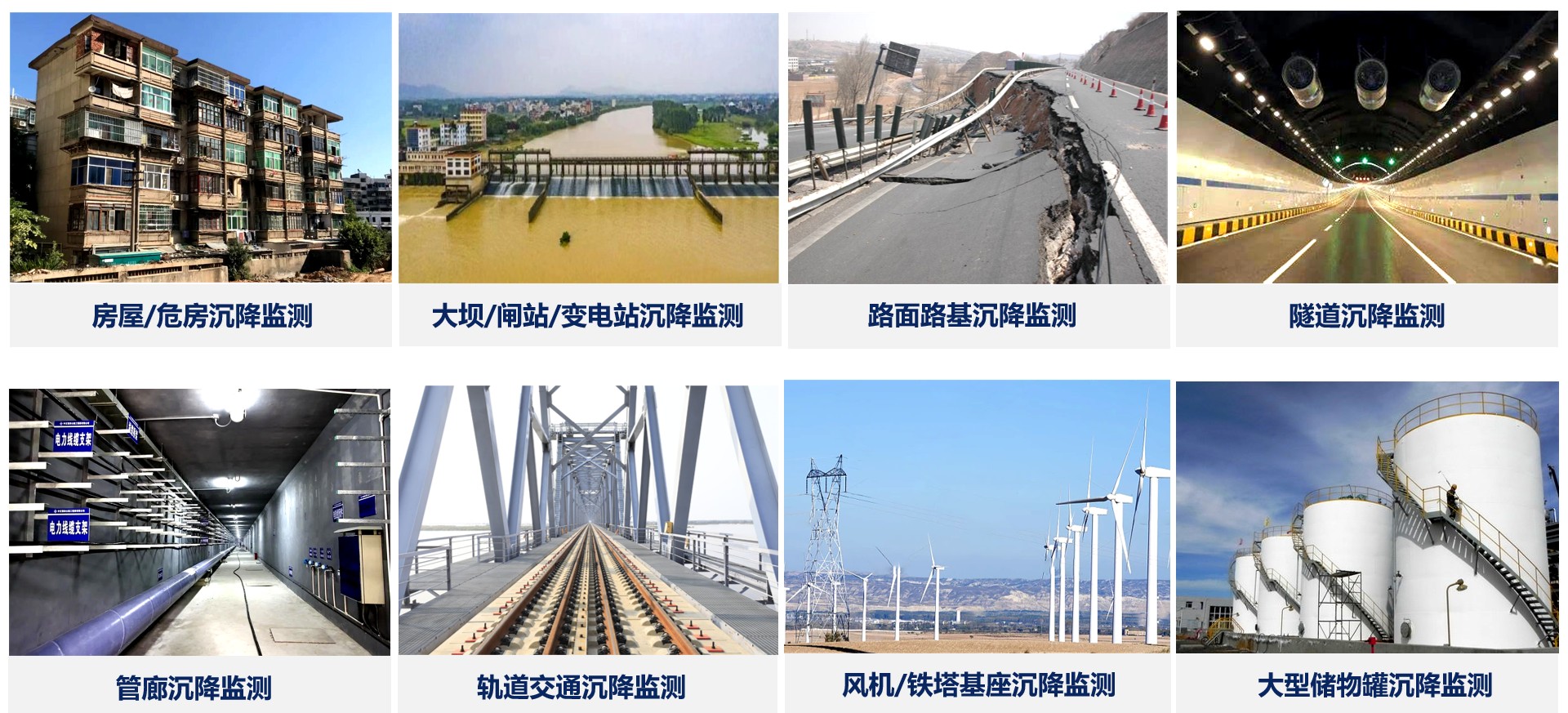 节段式位移计可应用于房屋/危房、大坝/闸站/变电站、路面路基、隧道、管廊、轨道交通、风机/铁塔基座、大型储物罐等沉降竖向位移自动化监测。